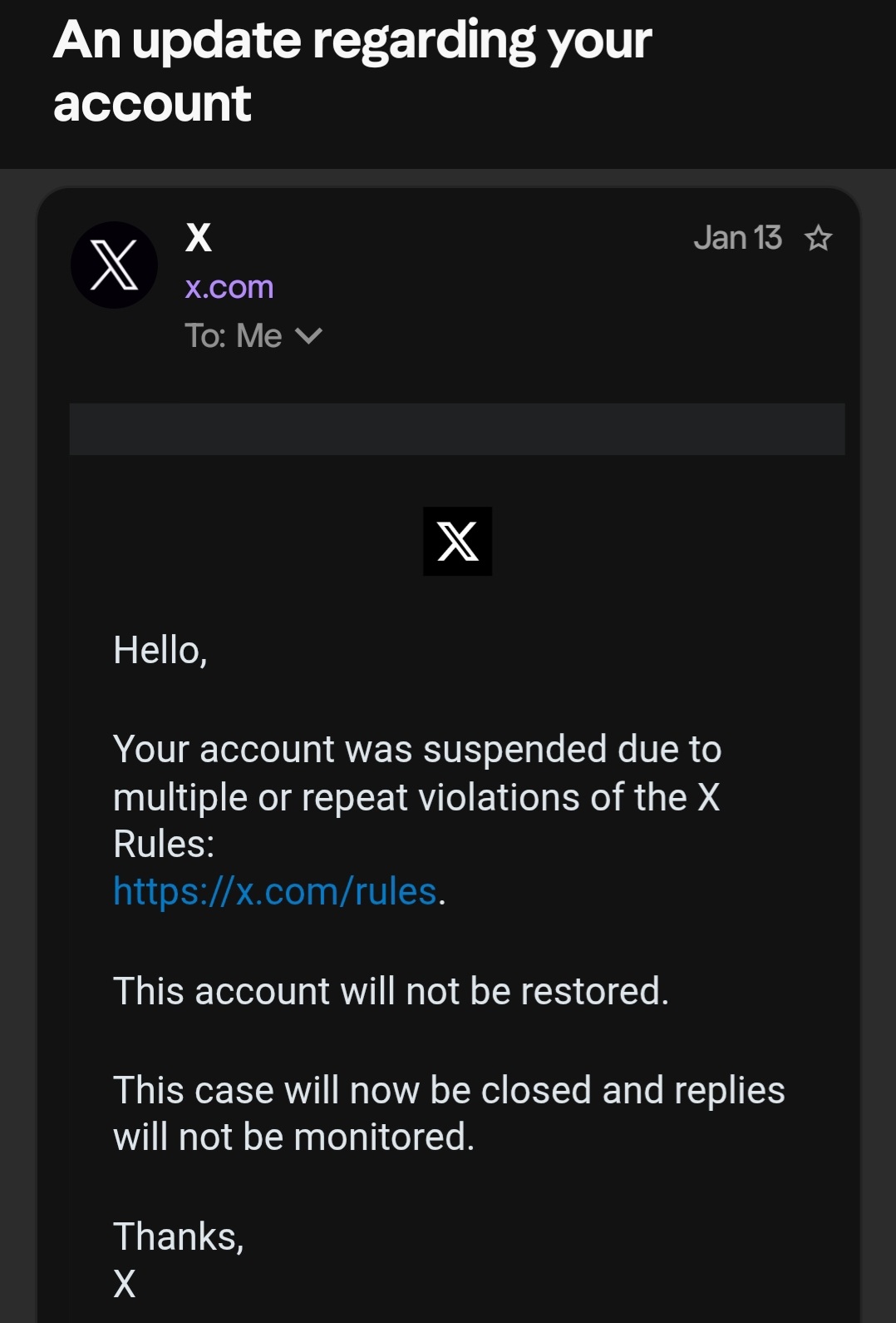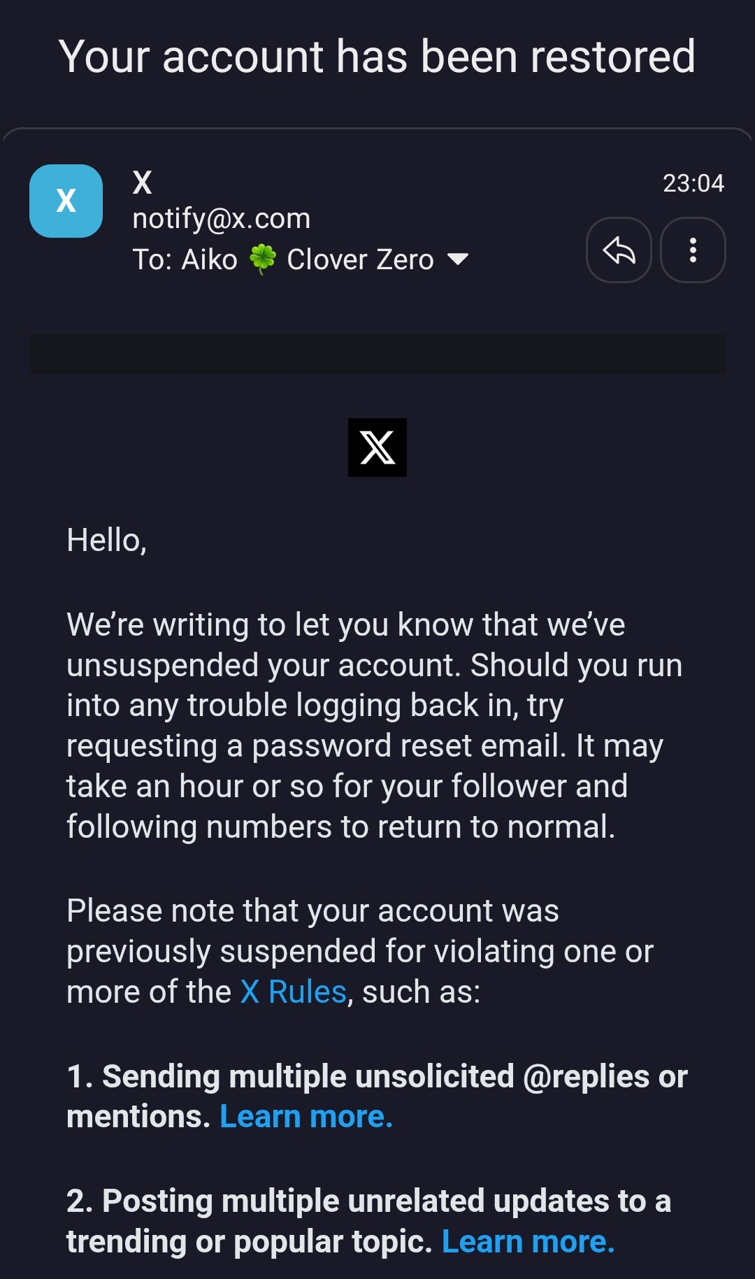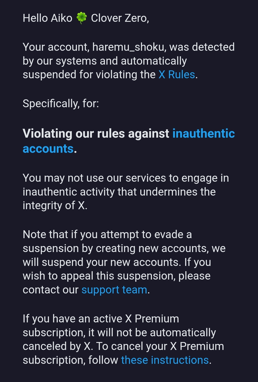 Going through the posts...whether your appeal gets accepted AND whether you actually get your acc restored or not is a gacha, after all...m a n 🫠 I don't have much hopes after last time ngl but no harm in trying and keep trying again I suppose...and maybe try sending appeals for my old acc again too lol. I stopped after FINALLY getting this email after so many appeals with no response (only finally got this one after using a certain copypasta LMAO), but it's apparently automated too 🥲