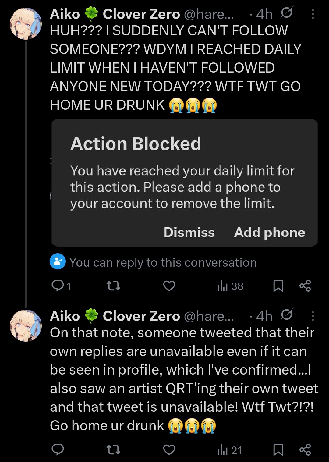Same reason as before too lol. I swear I'm innocent!! Wtf, Twt?!?! 🙃😭😭😭